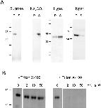 Figure 3. SpARC1 is a soluble luminal protein.A, Sub-cellular fractionation. Xenopus laevis embryos expressing myc-tagged SpARC1 were homogenized in a sucrose-containing buffer and diluted in to the same buffer (C), a carbonate-containing buffer (Na2CO3) or a hypertonic buffer (Hyper.). In other experiments the embryos were freeze-thawed and sonicated in a hypotonic buffer (Hypo.). All samples were centrifuged and the resulting pellets and supernatant fractions analysed by Western blotting. B, Proteolytic protection. Xenopus laevis embryos expressing myc-tagged SpARC1 were homogenized in a sucrose-containing buffer and the homogenates incubated with or without 1% v/v Triton X-100. Samples were then treated with the indicated concentration of proteinase K before Western blot analysis. |