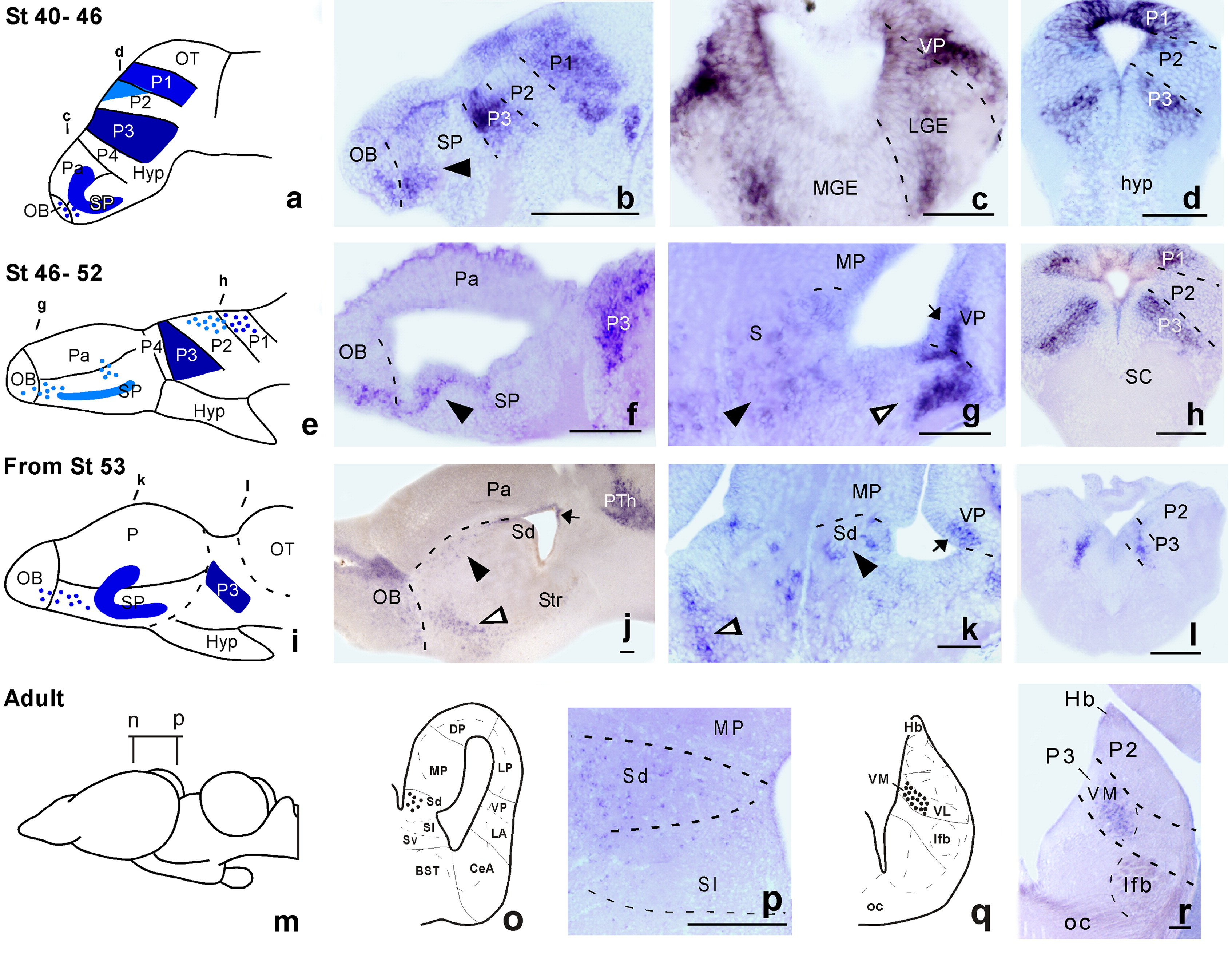 x-Pax6 expression in the developing and adult Xenopus forebrain. Schematic drawings of lateral views of the brain (a, e, and i) at the indicated period of Xenopus development, where x-Pax-6 expression is indicated in blue (anterior is left, dorsal is up). Photomicrographs of transverse and sagittal sections through the telencephalon, at embryonic and larval stages, after in situ hybridization for x-Pax6, whose level is indicated on the corresponding drawing. (bâc). Sagittal (a) and transverse (c,d) sections through the brain of a late embryo showing x-Pax-6 expression pattern at rostral telencephalic (c) and diencephalic levels (d). (fâh). Sagittal (f) and transverse (g,h) sections through the brain of a premetamorphic larva showing x-Pax-6 expression pattern at telencephalic (g) and diencephalic levels (h). (jâl). Transverse sections through the brain of a prometamorphic larva showing x-Pax-6 expression pattern at telencephalic (j,k) and diencephalic levels (l). Schematic drawings of a transverse hemisection (o,q) and photomicrographs (p,r) of transverse sections through the adult Xenopus forebrain, showing x-Pax-6 expression in the telencephalon (p) and diencephalon (r). Sections levels are indicated in the schematic drawing of an adult brain in lateral view (m). Scale bars = 100 μm. Abbreviations: Acc, nucleus accumbens; BST, bed nucleus of the stria terminalis; CeA, central amygdala; DP, dorsal pallium; Hb, habenula; Hyp and hypo, hypothalamus; LA, lateralamygdala; lfb, lateralforebrain bundle; LGE, lateral ganglionic eminence; LP, lateralpallium; MGE, medial ganglionic eminence; MP, medialpallium; OB, olfactory bulb; oc, optic chiasm; OT, optic tectum; Pa, pallium; PTh, prethalamus; P1âP4, prosomeres 1â4; S, septum; SP, subpallium; SC, nucleus suprachiasmatic; Sd, septum dorsalis; Sl, septum lateralis; Str, striatum; Sv, septum ventralis; VL, ventrolateral nucleus of the thalamus; VM, ventromedial nucleus of the thalamus; VP, ventralpallium.