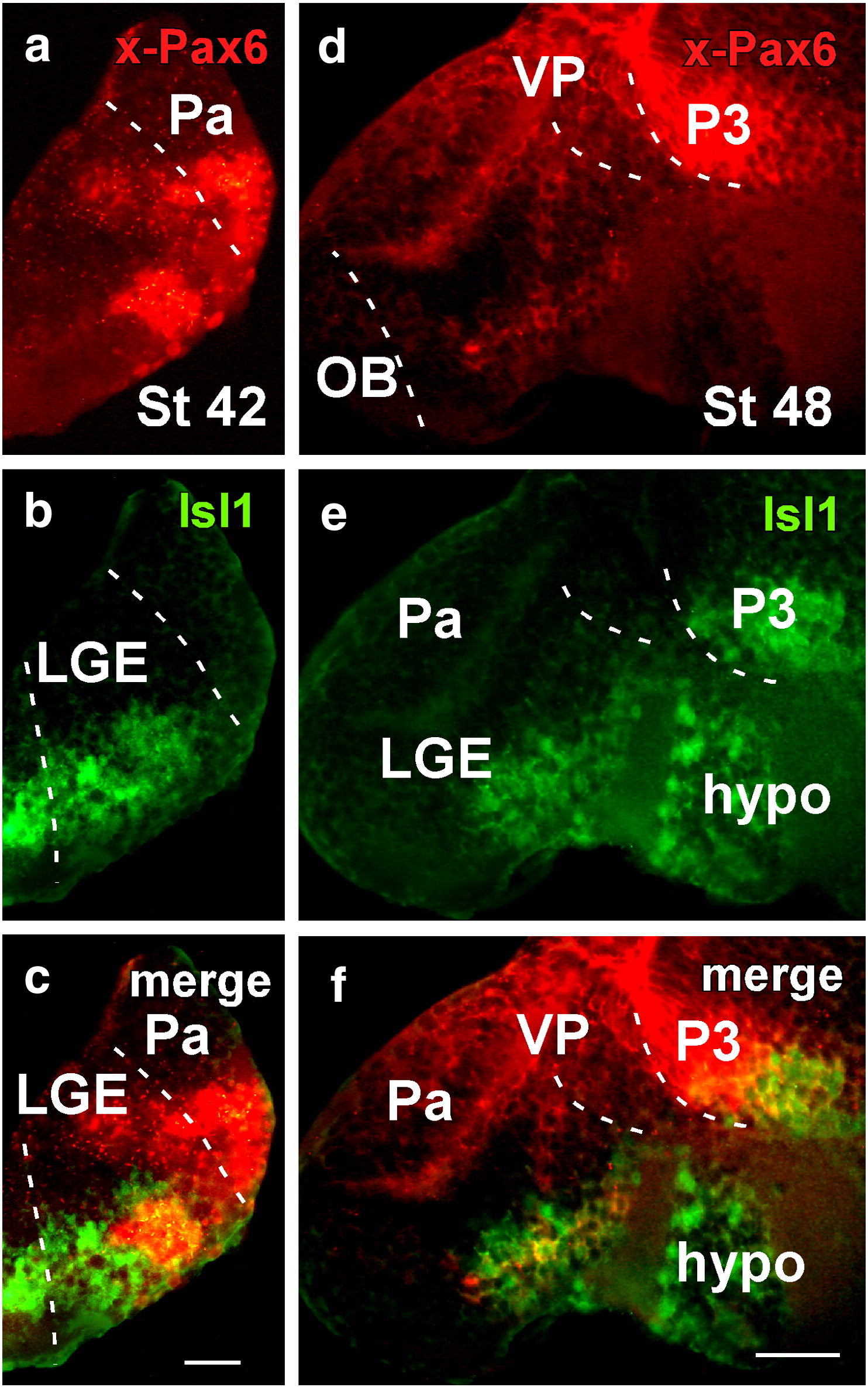 x-Pax6 cells are located in subpallial Isl-1 positive territories. Photomicrographs of transversals (a,b,c) and sagittal (d,e,f) sections through the telencephalon at embryonic and larval stages, after in situ hybridization for x-Pax6 (red) combined with Isl1 immunohistofluorescence (green). The merge images (c,f) show x-Pax6 cells which clearly enter the Isl1-postive striatal territory. Scale bar = 50 µm.