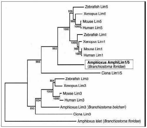 Figure 2. Neighbor-Joining phylogenetic analysis of amphioxus AmphiLim1/5 protein in the context of closely related LIM-homeodomain proteins from other chordates. Tree topology with bootstrap support based on 1000 replicates is constructed with Clustal_X.