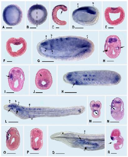 Figure 3. AmphiLim1/5 expression in developing amphioxus. Whole mount side views with anterior toward left. Sections are viewed from posterior end of animal. Whole mount and section scale lines respectively 50 μm and 25 μm. A) Blastula with expression in animal hemisphere. B) Mid-gastrula in blastopore view with expression in dorsal quadrant. C) Section in plane of dashed line in B; expression in ectoderm and dorsal mesendoderm (arrow). D) Side view of late gastrula with expression in neural plate and in posterodorsal mesendoderm. E) Section through a in D showing expression in neural plate. F) Section through b in D showing expression in dorsal mesendoderm. G) Side view of mid-neurula with expression in central nervous system, hindgut, rudiment of Hatschek's right diverticulum (asterisk), and first somite on left side (arrow). H) Section through a in G showing expression in anterior neural plate, epidermis on left side, Hatschek's right diverticulum (single arrow), but not in Hatschek's left diverticulum (twin arrow). I) Section through b in G showing expression on epidermis on left side and in most anterior somite on left side (arrow). J) Section through c in G showing expression in hindgut, but not in notochord (arrow). K) Dorsal view of mid-neurula showing expression in central nervous system, hindgut, and first somite on left side (arrow). L) Side view of early larva with expression in cells of dorsal nerve cord, rostral coelom (single arrow), Hatschek's nephridium (twin arrows), mesoderm associated with rudiment of second gill slit (asterisk), and neurenteric canal (arrowhead) of tail bud. M) Section through a in L showing expression in ventral and lateral cells of central nervous system and in rostral coelom (arrow). N) Section through b in L showing expression in ventral and lateral cells of central nervous system, in epidermis on left side, but not in Hatschek's left diverticulum (arrow). O) Section through c in L showing expression in epidermis on left side and in wall of Hatschek's nephridium (arrow). P) Section through d in L with expression in mesoderm cells near rudiment of second gill slit. Q) Side view of anterior end of later larva with expression in Hatschek's nephridium (single arrow) and in epidermis bordering upper lip of mouth (twin arrows). R) Section through a in Q, at level of mouth (arrow), showing expression in upper lip epidermis and in underlying Hatschek's nephridium.
