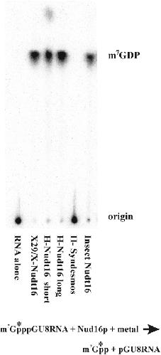 Figure 2. Insect Nudt16 protein is active for decapping RNA. Cap-labeled U8 RNA was incubated in the presence of buffer, Mn2+ and protein (as indicated) for 30 min at 37°C (reaction indicated below). Samples of the reactions were spotted on a TLC, which was developed and then visualized on a phosphorimager. The Xenopus (X29/X-Nudt16) protein, present as a positive control, released m7GDP from the cap-labeled RNA. The two human proteins, which varied by an unrelated amino terminal extension, were both efficient at decapping the U8 RNA. Insect (sharpshooter) Nudt16 protein hydrolyzed the RNA to release the m7GPD cap comigrating with that cleaved by the other orthologs. The human H-Syndesmos protein displays no decapping activity.