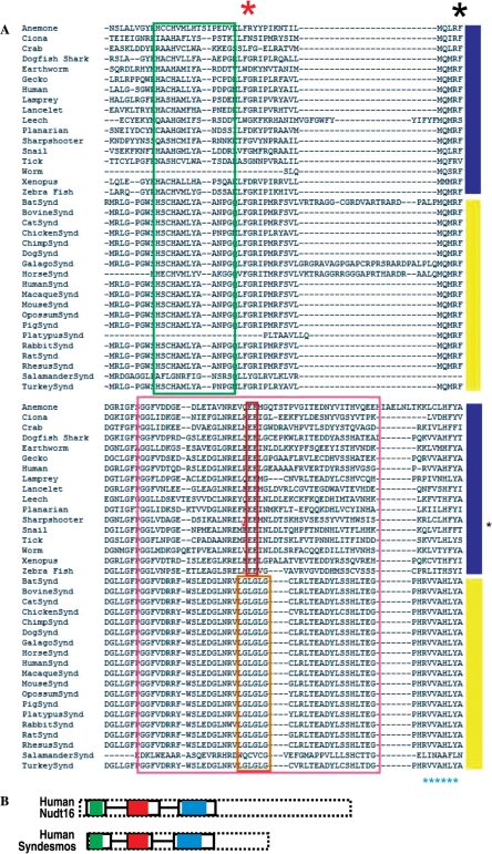 Figure 3. Nudt16 and Syndesmos are closely related members of a gene family. (A) Alignment of a portion of the Syndesmos protein from 17 organisms (denoted by yellow box on right edge) and the corresponding region of Nudt16 from 10 organisms (marked with the blue box on right edge). All Syndesmos orthologs have a repeated glycine/leucine sequence (orange box) in place of the glutamic acid residues (heavy red box) required for catalysis in the NUDIX domain (red box). The green box is the conserved region in Nudt16 proteins, equivalent to the green box in Figure 1. Syndesmos paralogs have all three conserved regions but lack a functional NUDIX domain. The central parts of the proteins are aligned here. The accession numbers are in Supplementary Table 1. (B) Genomic organization of the orthologs in human. Dashed boxes indicate the transcription unit, solid boxes are exons, horizontal lines are introns and the conserved domains are color coded as per Figure 1. Note Nudt16 has a longer 5′-UTR and 3′-UTR than Syndesmos.