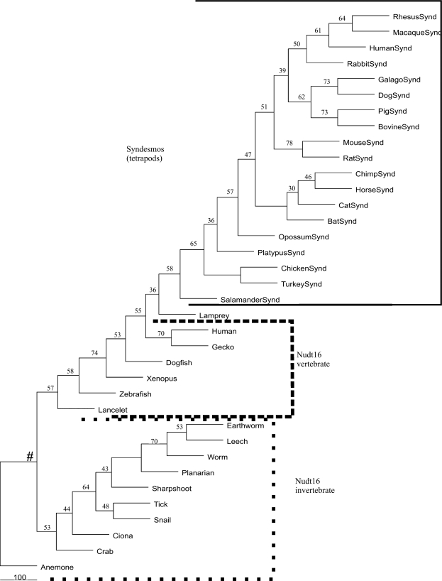 Figure 5. A tree of Nudt16 and Syndesmos identifies them as paralogs. Amino acid sequences were aligned, graphed and analyzed as in Methods section. The tree was visualized with TreeView. Bootstrap values are shown. Vertebrates and invertebrates are separated and phylogenetic relationships are comparable to the generic tree of evolution. Syndesmos sequences branch from the tetrapod lineage of the Nudt16 sequences.