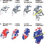Figure 7. Structural comparison of paralogous proteins. (A) Molecular modeling of the orthologs and paralogs of Xenopus Nudt16p. The Xray crystal structure of Xenopus X29/Nudt16p (PDB: 2A8P) was used to model the human and sharpshooter Nudt16p proteins and human Syndesmos. Selected conserved residues were highlighted in the ribbon models to correctly align the models relative to each other. The blue strand (CVTHFY) is indicated with blue asterisks in Figure 4. The black asterisk is a conserved Phe residue near the catalytic site, while the red asterisk is a second conserved Phe residue indicated in Figure 4. The yellow line in the Xenopus protein is oriented across the dimer interface; the monomer above the line is oriented and positioned relative to the other three proteins. (B) Electrostatic charge potential of structures. Once the proteins were correctly oriented, electrostatic charge potential was calculated. Blue is positively charged surface and red is negatively charged. The yellow line in the Xenopus protein is oriented across the dimer interface as in (A).