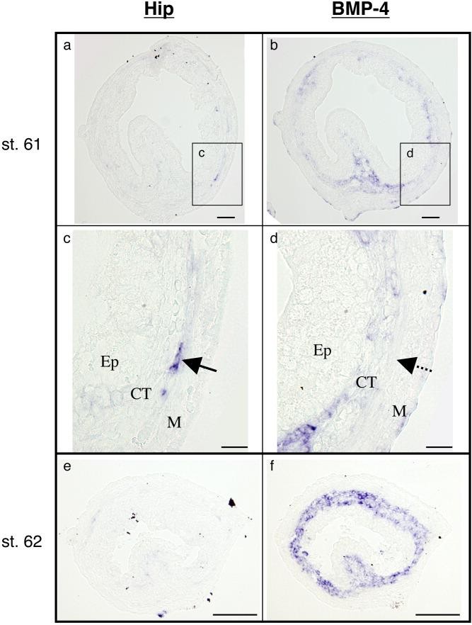 Figure 3. Comparison of hedgehog interacting protein (Hip) and bone morphogenetic protein (BMP) -4 localization. Cross-sections of the intestine at stage 61 (a-d) and stage 62 (e,f) were hybridized with antisense Hip (a,c,e) and BMP-4 (b,d,f) probes. To compare the localization of Hip with that of BMP-4, serial sections were used. Dark blue deposits indicate the sites of probe binding. Light or dark brown pigments are melanin. c,d: Higher magnification of a boxed area in a and b, respectively. c,d: The signals for BMP-4 mRNA (d, dashed arrow) are hardly detectable where Hip is strongly expressed (c, solid arrow). BMP-4 is highly expressed at stage 62 (f) when the expression of Hip decreases (e) and that of Shh peaks (Fig. 2c). Ep, epithelium; CT, connective tissue; M, muscle layer. Scale bars = 100 mu m in a,b,e,f, 20 mu m in c,d.