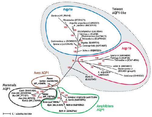 CONCLUSION: We propose that 1) Aqp1a and Aqp1b are encoded by distinct genes that probably originated specifically in the teleost lineage by duplication of a common ancestor soon after divergence from tetrapods, 2) Aqp1b possibly represents a neofunctionalized AQP adapted to oocytes of marine and catadromous teleosts, thereby contributing to a water reservoir in eggs and early embryos that increases their survival in the ocean, and 3) Aqp1b independently acquired regulatory domains in the cytoplasmatic C-terminal tail for the specific control of Aqp1b expression in the plasma membrane.