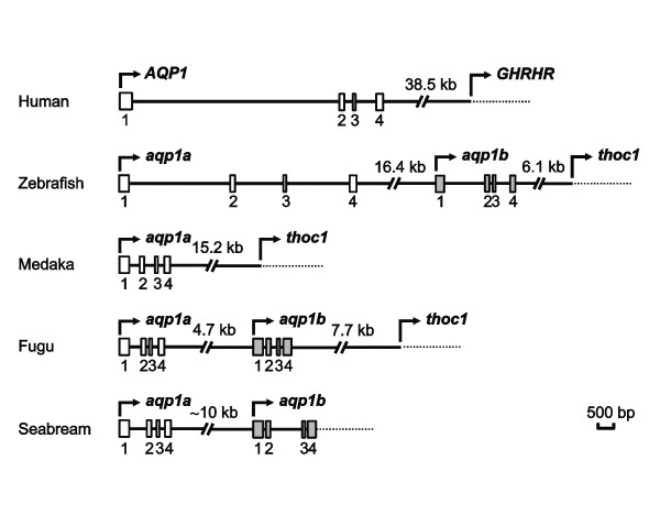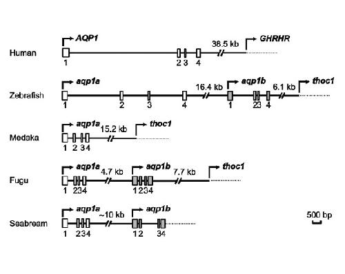 Figure 2. Genomic organization of human AQP1 and teleost aqp1a and aqp1b genes. Schematic representation of human AQP1 [67], and zebrafish, fugu, medaka and sea bream aqp1a and aqp1b gene loci. White (human AQP1 and teleost aqp1a) and grey (teleost aqp1b) boxes indicate exons with coding regions only. Downstream genes from human AQP1 and teleost aqp1b are growth hormone releasing hormone receptor (GHRHR) and THO complex subunit 1 (thoc1), respectively.