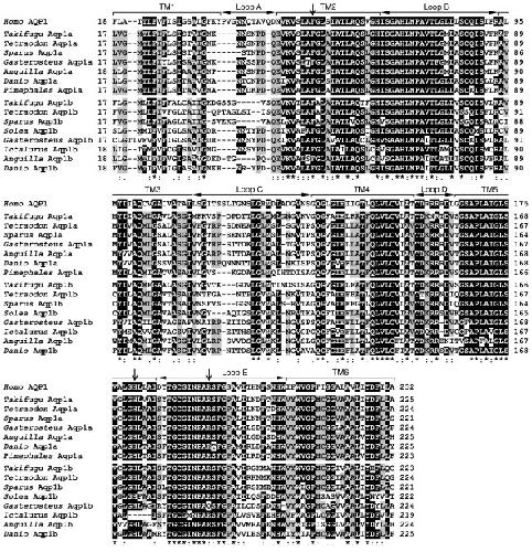 Figure 3. Amino acid sequence alignment of human AQP1 and teleost Aqp1a and Aqp1b. The six transmembrane (TM) domains and connecting loops A-B of human AQP1 are indicated by brackets and horizontal arrows, respectively. The vertical arrows above human AQP1 show the conserved residues Phe56, His180 and Arg195 (human AQP1 numbering) in water-selective AQPs. Identical residues between human AQP1 and teleost AQP1-like sequences are indicated with an asterisk, whereas conserved amino acid substitutions and substitutions with similar amino acids are indicated by a double or single dot, respectively. Residues conserved in human and most teleost sequences are shaded in black, and residues different from human but conserved between most of the teleost Aqp1a and Aqp1b sequences are shaded in grey.