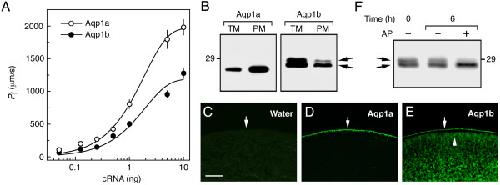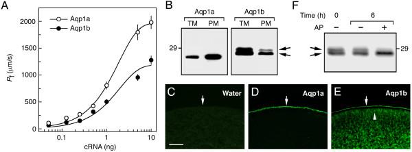 Figure 5. Differential localization of sea bream Aqp1a and Aqp1b expressed in X. laevis oocytes. (A) Pf of oocytes expressing increasing amounts of Aqp1a or Aqp1b cRNA. Values represent the mean ± SEM (n = 6–10 oocytes) from 3 independent experiments. (B) Immunoblots of total and plasma membrane equivalents (TM and PM, respectively) of oocytes expressing 1 ng of Aqp1a or Aqp1b. The arrows indicate two very close Aqp1b reactive bands. (C-E) Immunofluoresence microscopy of water-injected and Aqp1a- or Aqp1b-expressing oocytes. Arrows show localization of the protein at the plasma membrane. The arrowhead indicates Aqp1b in the cytoplasm below the plasma membrane. Bar, 50 μm. (F) Immunoblot of total membrane fraction of Aqp1b-expressing oocytes incubated with or without alkaline phosphatase (AP) for 6 h. In B and F, the apparent molecular mass of a 29-kDa marker is indicated on the left and right, respectively.