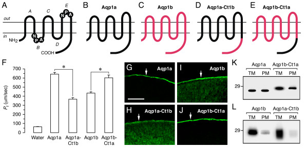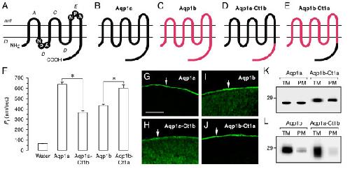 Figure 6. Functional properties and subcellular localization of wild-type (WT) sea bream Aqp1a and Aqp1b, and of their chimeric proteins, in oocytes. (A) Membrane topology of AQP family members showing the six transmembrane helices with five connecting loops (A-E), and two conserved Asn-Pro-Ala (NPA) motifs in loops B and E. (B-E) WT Aqp1a (B) and Aqp1b (C), Aqp1a chimera in which the C-terminus of Aqp1a was exchanged with that of Aqp1b (Aqp1a-Ct1b; D), and Aqp1b chimera in which the C-terminus of Aqp1b was exchanged with that of Aqp1a (Aqp1b-Ct1a; E). (F) Pf of oocytes expressing 1 ng of cRNA encoding WT or chimeric proteins. Values represent the mean ± SEM (n = 5–8 oocytes) from a representative experiment. The asterisk denotes statistically significant differences (p < 0.01). (G-J) Immunofluorescence microscopy of oocytes localizing WT Aqp1a and Aqp1b-Ct1a exclusively at the plasma membrane, whereas WT Aqp1b and Aqp1a-Ct1b are also in the cytoplasm. Sections shown in G and J were probed with the anti-Aqp1a antisera, whereas the sections in H and I were probed with the anti-Aqp1b antisera. Bar, 50 μm. (K-L) Immunoblots of total and plasma membrane equivalents (TM and PM, respectively) of oocytes expressing the differents cRNAs. Blots were probed as indicate above. The apparent molecular mass of a 29-kDa marker is indicated on the left.
