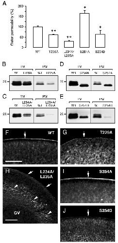 Figure 8. Role of specific residues in the sea bream Aqp1b C-terminal tail for intracellular trafficking in oocytes. (A) Water permeability of oocytes expressing wild-type (WT) or mutant Aqp1b. Oocytes were injected with cRNAs encoding WT Aqp1b (0.25 or 1 ng), Aqp1b-T229A (1 ng), Aqp1b-L234A/L235A (1 ng), Aqp1b-S254A (0.25 ng) or Aqp1b-S254D (0.25 ng). Permeability is expressed in % related to oocytes injected with WT Aqp1b. Values are the mean ± SEM of 3–5 experiments (n = 10–15 oocytes per treatment). The asterisks denote statistically significant differences (*, p < 0.05; **, p < 0.01). (B-E) Immunoblots of total and plasma membrane equivalents (TM and PM, respectively) of oocytes expressing WT or mutant Aqp1b. The apparent molecular mass of a 29-kDa marker is indicated on the left. (F-J) Localization of Aqp1b mutants in oocytes. The plasma membrane is indicated by arrows, and retention of Aqp1b-L234A/L235A proteins possibly in the ER is indicated by arrowheads (H). Bars, 100 μm.