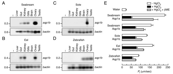 Figure 4. Gene expression pattern and functional characterization of teleost Aqp1b. (A-D) Representative RT-PCR analysis of aqp1b (upper panels) and bactin (lower panels) transcripts in sea bream (A), European eel (B), Senegalese sole (C) and zebrafish (D) tissues. PCR products were detected by Southern blot. Minus indicates absence of RT during cDNA synthesis. The size (kb) of PCR products and molecular markers are indicated on the left and right, respectively. (E) Pf and Hg2+ inhibition of X. laevis oocytes expressing teleost Aqp1a or Aqp1b. Oocytes were injected with cRNAs encoding sea bream Aqp1a or Aqp1b (1 ng), eel Aqp1b (10 ng), Senegalese sole Aqp1b (10 ng) or zebrafish Aqp1b (10 ng), or with 50 nl of water (control). The Pf was assayed in the presence or absence of 0.7 mM HgCl2. Some oocytes treated with HgCl2 were incubated with 5 mM β-mercaptoethanol (βME) for 15 min before swelling measurements. Values represent the mean ± SEM (n = 6–10 oocytes) from a representative experiment.