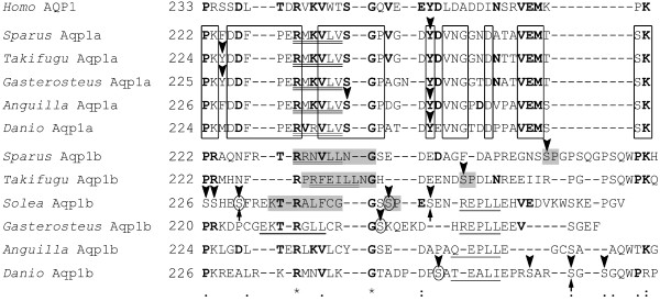 Figure 7. Amino acid sequence alignment of the C termini of human AQP1, and Aqp1a and Aqp1b from representative teleosts. At the bottom, identical residues are indicated by asterisks, whereas conserved amino acid substitutions and substitutions with similar amino acids are indicated by double or single dots, respectively. Residues of teleost Aqp1a and Aqp1b conserved in human AQP1 are in bold, and conserved residues in Aqp1a sequences are boxed. Double underlined residues indicate typical potential sorting and internalization sequences, whereas those single underlined indicate other sorting-like motifs. In each sequence, potential Ser, Thr and Tyr phosphorylation sites (score ≥ 0.9) are indicated by arrowheads. Consensus sites for potential kinases are indicated: grey, candidate Pro-directed kinase and preceding docking domain; arrows, casein kinase I (CK1); circles, CK2. Other candidate phosphorylation sites shown do not match any eukaryotic linear functional motif included in the ELM resource.