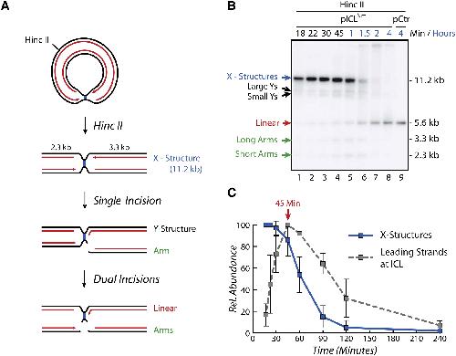 (A) Expected intermediates resulting from single or dual incisions near the ICL (see text). Note that the first incision could also occur to the left of the ICL, giving rise to a short arm and large Y structure.