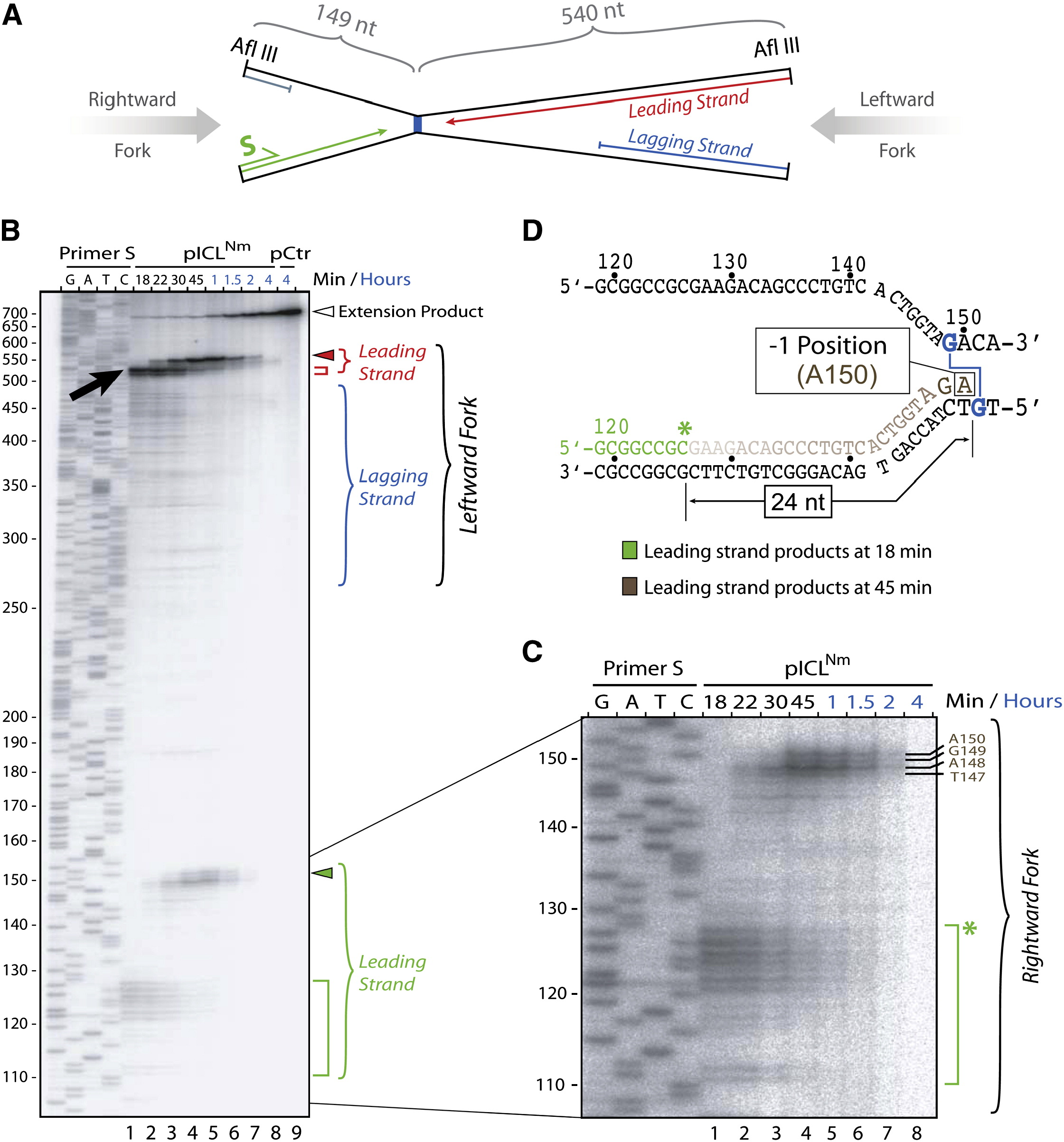 (B) Detection of nascent strands. pICLPt or pCtr was replicated in the presence (lanes 1 and 2) or absence (lanes 3 and 4) of 32P-α-dATP. After 4 hr, replication products were digested with AflIII and AseI, separated on a 5% denaturing polyacrylamide gel and transferred to a Nylon membrane. Radioactive products were visualized using a phophorimager.