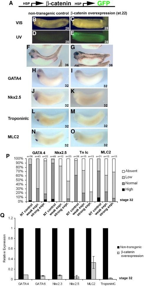 Fig. 4. Overexpression of β-catenin during organogenesis stages inhibits heart muscle development. (A) Schematic representation of transgene for concomitant overexpression of a stabilized form of β-catenin and GFP in transgenic Xenopus embryos. (BâE) Identification of non-transgenic control (B,D) versus transgenic embryos (C, E) induced at stage 22 by heat shock treatment to overexpress concomitantly GFP and β-catenin, viewed at stage 28 under UV light (D, E, compare with the same embryos viewed under visible light in B and C, respectively). Note strong fluorescence due to GFP expression in transgenic embryo (E). (F, G) External morphology and TroponinIc expression of non-transgenic control (F) and β-catenin-overexpressing transgenic (G) embryo at stage 36. Note abnormal morphology in β-catenin-overexpressing embryo, particularly the shortened axis and tail, as well as, much reduced TroponinIc expression. (HâQ) Analysis of heart marker gene expression with whole-mount RNA in situ hybridization in non-transgenic control (H, J, L, N) and β-catenin-overexpressing transgenic embryos (I, K, M, O) at stage 32. Note much reduced and restricted GATA4 expression (I), absence of detectable Nkx2.5 (K) and TroponinIc (TnIc) (M) expression and restricted domain of MLC2 expression (O) in β-catenin-overexpressing embryos. (P) Percentage bar chart of whole-mount RNA in situ hybridization analysis of heart marker expression in non-transgenic (NT) control embryos, in transgenic embryos with weak GFP and therefore presumably weak β-catenin expression (weak expr.) and in transgenic embryos with strong GFP and therefore presumably strong β-catenin expression (strong expr.). Note reduction of GATA4, Nkx2.5, TnIc and MLC2 expression in embryos overexpressing β-catenin. (Q) Bar chart of qPCR analysis of heart marker gene expression in stage 32 embryos. Note reduced cardiogenic gene expression in β-catenin-overexpressing transgenic embryos. |