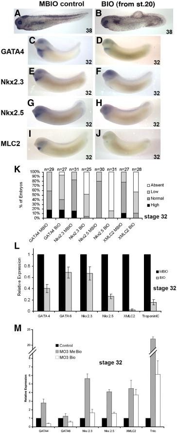 Fig. 5. Wnt signaling agonist treatment during organogenesis stages reduces heart marker gene expression, even in Wnt6 morphants. (A, B) Morphology of stage 38 embryos after control treatment with MeBIO (A) or treatment with the Wnt/β-catenin signaling agonist BIO at 12 μM, from embryonic stage 20 to control stage 32. Note multiple morphological defects in BIO-treated embryos in addition to absence of any discernable heart; including enlarged, elongated oval-shaped eyes, which extend toward the anterior; slightly reduced cement glands; reduced pigmentation; a shortened tail; and skin defects. (CâJ) Analysis of marker gene expression at stage 32 with whole-mount RNA in situ hybridization in control embryos treated with 10 μM MBIO (C, E, G, I) or experimental embryos treated with 10 μM BIO (D, F, H, J) from stage 20 to 32. (K) Percentage bar chart of whole-mount RNA in situ hybridization analysis of marker gene expression in Wnt agonist-treated (BIO) and control-treated embryos (MBIO). Note that whole-mount RNA in situ hybridization analysis (CâK) shows that all of the marker genes associated with heart development are down-regulated to a various degree by treatment with BIO. (L) Bar chart of quantitative RT-PCR (qPCR) analysis of gene expression of heart development (GATA4, GATA6, Nkx2.3 and Nkx2.5) and heart muscle differentiation markers (TroponinIc and MLC2) in Wnt agonist- and control-treated embryos at stage 32. Note that the heart muscle differentiation markers TroponinIc and MLC2 are most affected along with Nkx2.5 at this stage of development. (M) Bar chart of quantitative RT-PCR (qPCR) analysis of marker gene expression at stage 32 in embryos injected with Wnt6 MO3 and subsequently treated with the Wnt/β-catenin signaling agonist BIO or MeBIO (10 μM from stage 20). Control embryos were injected with control MO and treated with MeBIO. Note that BIO-mediated activation of Wnt/β-catenin signaling during organogenesis stages rescues to a varying extent the deregulated expression of heart development and heart muscle marker genes in Wnt6 morphants. |