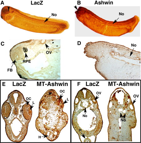 Figure 4. Anterior defects in embryos overexpressing ashwin. Embryos were injected in the animal pole at the two-cell stage with 0.2 ng of mRNA encoding either ashwin or MT-ashwin; results for both constructs were indistinguishable. Control embryos were injected with β-galactosidase mRNA (LacZ). Embryos were cultured until st. 30, when they were fixed and processed for immunohistochemistry with the Tor-70 antibody to visualize the notochord (No). A,B: The anterior limit of the notochord (arrow) is located at the level of the midbrain in LacZ embryos (A) and at the far anterior end of an Ashwin embryo (B). C: A sagittal section of a LacZ embryo showing the forebrain (FB), pigmented retina (RPE), and otic vesicle (OV). D: A similar section through an Ashwin embryo shows that all tissue anterior to the notochord is a solid mass. E,F: Tadpoles expressing β-galactosidase (LacZ) or myc-ashwin reveal characteristic defects appearing at later stages. E: A cross-section through the eye reveals that the right optic cup (OC; arrow) is small and underdeveloped, whereas the left optic cup has failed to extend away from the midline. The right lens (L) is rudimentary. Overall, anterior patterning is displaced so that the heart (H) appears at the same level as the eye; normally, the heart appears at the level of the otic vesicle, as seen in the LacZ embryo at left in F. F: Sections through more posterior regions of control (LacZ) and myc-ashwinâinjected embryos show a less severe phenotype in the region of the hindbrain compared with more anterior regions. The dorsal neural tube is thin, and the notochord has split (central arrows). The otic vesicle (arrow at right) is frequently the most anterior structure visible in ashwin-injected embryos with anterior truncation. |