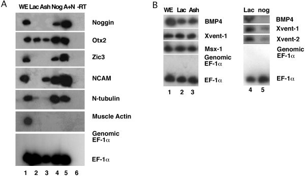 Figure 9. Reverse transcriptase-polymerase chain reaction (RT-PCR) analysis of gene expression in animal cap ectoderm overexpressing ashwin. A: Animal caps were isolated from late blastula embryos injected with 200 pg of mRNA encoding either β-galactosidase (lac, lane 2), ashwin (A, lane 3), or noggin (N, lane 4). Animal caps were also collected from embryos co-injected with 0.2 ng of ashwin mRNA and 0.25 ng of noggin mRNA (A + N, lane 5). Animal caps were collected for RT-PCR when control embryos reached stage (st.) 18. WE, whole embryo (lane 1). âRT, control sample prepared without reverse transcriptase (lane 6). EF-1α primers flank an intron, so any contaminating genomic DNA can be detected in each sample (n = 4 independent experiments). B: Expression of BMP4-inducible genes in animal caps overexpressing ashwin. Animal caps were isolated from embryos injected with 200 pg of either LacZ mRNA (Lac, lane 2) or Ashwin mRNA (Ash, lane 3) and collected for RT-PCR when controls reached st. 11. BMP4-inducible gene expression in animal caps overexpressing LacZ (Lac, lane 4) or noggin (nog, lane 5). Msx1 was also down-regulated in animal caps overexpressing noggin (data not shown) (n = 3 independent experiments). |