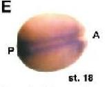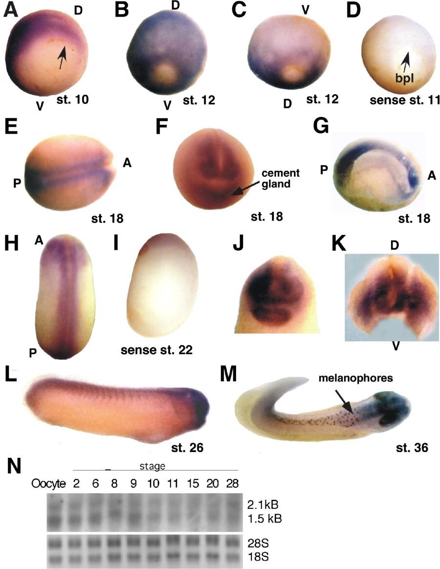 Figure 2. Spatial and temporal analysis of ashwin expression. Dorsal is toward the top, unless otherwise indicated. A: Stage (st.) 10; ashwin is expressed throughout the dorsal circumblastoporal zone. An arrow indicates the dorsal lip. B: A st. 12, dorsal view; expression is detected throughout the dorsal ectoderm and marginal zone. C: St. 12, ventral view; expression is excluded from the ventral hemisphere except for the circumblastoporal ring. D: Embryo hybridized with a sense probe. E: A st. 18, dorsal view; expression is visible in the neural ectoderm. F: A st. 18, frontal view reveals expression in anterior neural folds. G: A st. 18, midline sagittal dissection; expression is strongest in anterior and posterior neural domains but also is detected in the notochord and prechordal plate. H-K: At st. 22. H: Expression is detected throughout the developing nervous system and optic vesicles. I: Sense probe hybridization. J: Frontal view. K: Forebrain dissection; expression is detected in the ventral aspect of the brain and throughout the eye anlagen. L: At st. 26; ashwin is expressed throughout the central nervous system and in the tail bud. M: At st. 36; ashwin is expressed strongly in the brain and moderately in the posterior axial region. D, dorsal; V, ventral; A, anterior; P, posterior. N: Northern analysis of ashwin expression in Xenopus embryos at various embryonic stages. Each lane shows RNA isolated from two embryos at each of the stages indicated. The ashwin transcripts were visualized using a radiolabeled PCR probe. Two transcripts at 1.5 and 2.1 kb are expressed both maternally and zygotically. Levels of 18S and 28S rRNA are included to indicate the total amount of RNA loaded in each lane. |