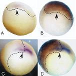 Figure 7. Cell lineage analysis of embryos injected with ashwin mRNA. Embryos were injected with 200 pg of myc-ashwin mRNA in the animal pole of one blastomere at the two-cell stage, fixed at early gastrula stages, hybridized in situ using the gsc probe, and then processed for immunohistochemistry using the anti-myc antibody. A,B: Single embryo photographed before (A) and after (B) immunohistochemistry; myc-ashwin is distributed throughout the dorsal lip. C,D: Second embryo photographed before (C) and after (D) immunohistochemistry; myc-ashwin is present only on one side of the dorsal lip. Dashed lines indicate the edge of the region expressing myc-ashwin; arrows indicate position of the dorsal lip. |