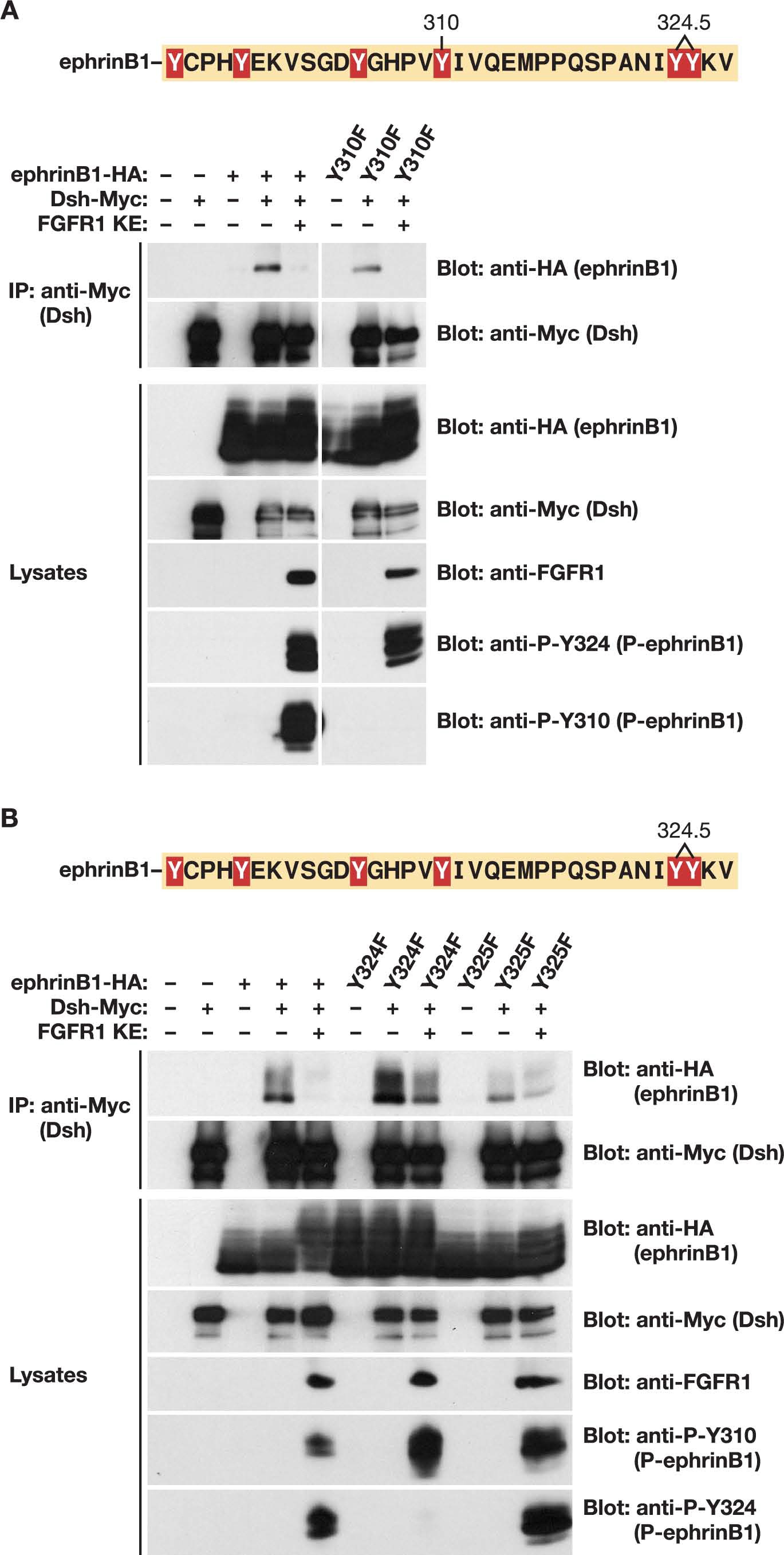 The Eph family of receptor tyrosine kinases and their membrane-bound ligands, the ephrins, have been implicated in regulating cell adhesion and migration during development by mediating cell-to-cell signaling events. The transmembrane ephrinB1 protein is a bidirectional signaling molecule that signals through its cytoplasmic domain to promote cellular movements into the eye field, whereas activation of the fibroblast growth factor receptor (FGFR) represses these movements and retinal fate. In Xenopus embryos, ephrinB1 plays a role in retinal progenitor cell movement into the eye field through an interaction with the scaffold protein Dishevelled (Dsh). However, the mechanism by which the FGFR may regulate this cell movement is unknown. Here, we present evidence that FGFR-induced repression of retinal fate is dependent upon phosphorylation within the intracellular domain of ephrinB1. We demonstrate that phosphorylation of tyrosines 324 and 325 disrupts the ephrinB1/Dsh interaction, thus modulating retinal progenitor movement that is dependent on the planar cell polarity pathway. These results provide mechanistic insight into how fibroblast growth factor signaling modulates ephrinB1 control of retinal progenitor movement within the eye field.
