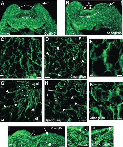 asterisks) in B atthe hinge-point onthe wild-typeside(G) andthe XneogPan MOside(H). I–K, Posterior NF elevation is inhibited