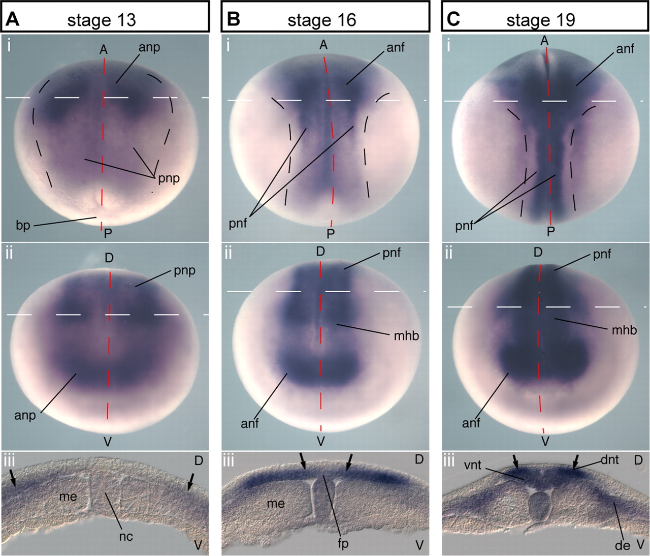 neural plate(anp)(Aii),(B) inthest16 posterior NFs(pnf)(Bi, Biii, arrows) and anterior NFs(anf)(Bii) with expression expanding