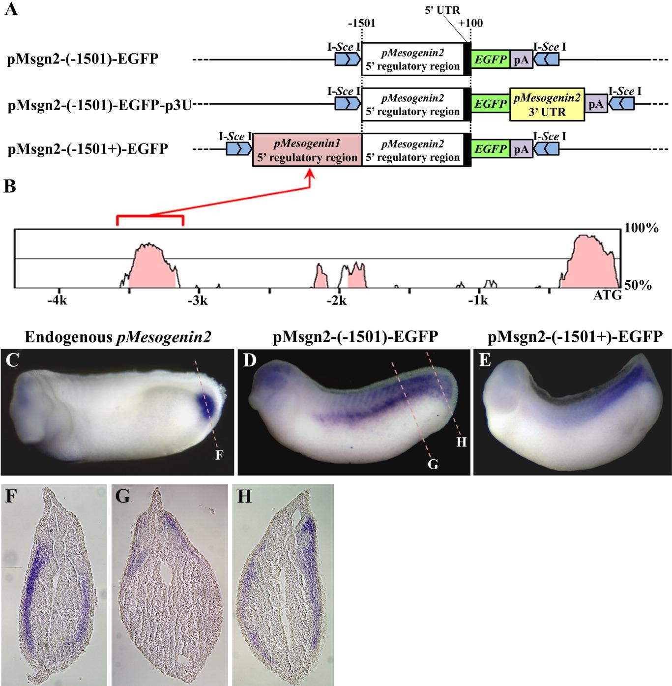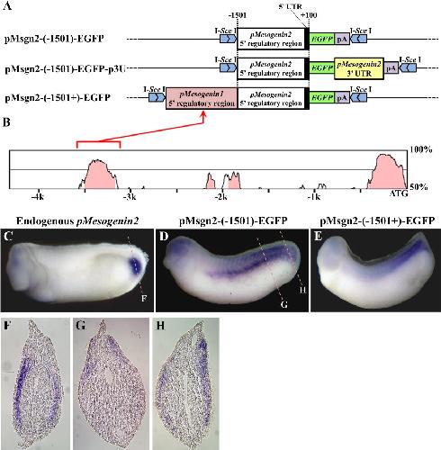 Figure 3. The pMesogenin2 5 prime regulatory region drives expression of the EGFP reporter gene in PSM. A: Schematic diagrams of reporter constructs used in transgenesis. In pMsgn2-(-1501)-EGFP, the pMesognein2 5 prime regulatory region-EGFP cassette is flanked at both ends by two I-Sce I recognition sites. In pMsgn2-(-1501)-EGFP-p3U, the pMesogenin2 3 prime UTR is inserted between EGFP and the poly(A) signal (pA). In pMsgn2-(-1501+)-EGFP, the pMesogenin1 5 prime regulatory region is inserted between pMesogenin2 5 prime regulatory region and the I-Sce I recognition site. B: X. laevis pMesogenin1 and X. tropicalis pMesgenin1 5 prime regulatory regions compared using mVISTA (http://genome.lbl.gov/vista/mvista/submit.shtml) with the X. laevis sequence as the baseline. The downward bracket indicates the region added in pMsgn2-(-1501+)-EGFP. C-E: Whole-mount in situ hybridization for pMesogenin2 or EGFP. C: The endogenous pMesogenin2 expression at stage 27. D: In transgenic embryos with pMsgn2-(-1501)-EGFP, EGFP expression was observed in PSM, somites, and the head region. E: In transgenic embryos with pMsgn2-(1501+)-EGFP, EGFP expression was observed in PSM and somites, but was reduced in the head. F-H: Transverse sections at the positions indicated in C and D.