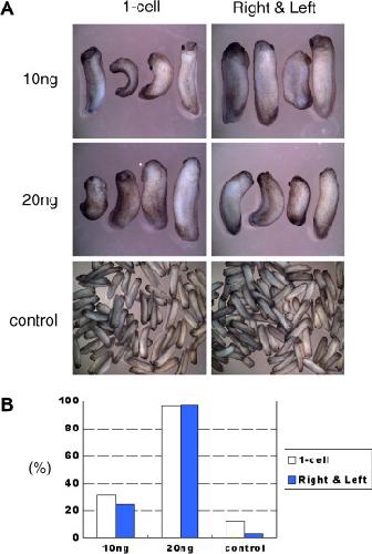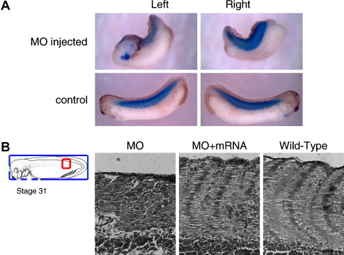 Fig. 4. Histological and morphological analyses. (A) Whole-mount in situ hybridization with a DIG-labeled antisense a-actin RNA probe using the embryo injected with