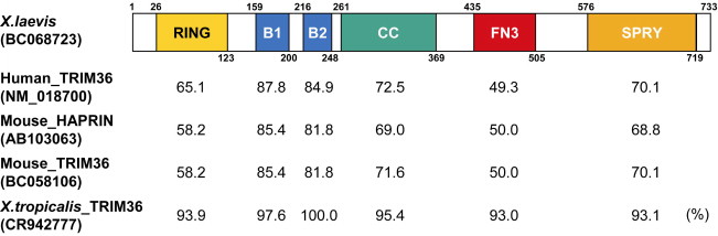 Fig. 1. Comparison of the TRIM36/HAPRIN amino acid sequence among species. Predicted TRIM36/HAPRIN amino acid sequences of X. laevis (GenBank Accession No.