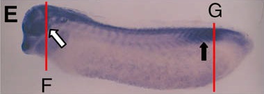 towards the left. Transverse sections at stage 28 at the head (F) and the posterior regions (G) are also shown. The positions of the sections are indicated in (E) as vertical lines.