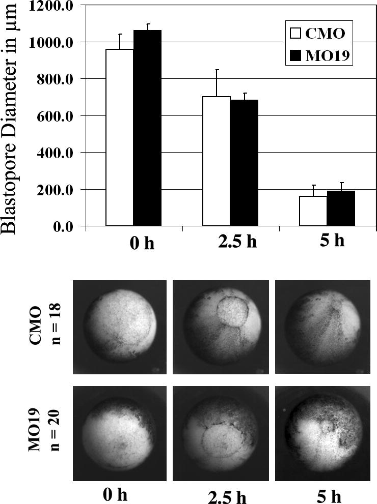 Fig. 4. ADAM19 is not required for blastopore closure. Time-lapse imaging of gastrula stage embryos injected with either a control MO (CMO) or the MO19. Embryos were microinjected with 10 ng of MO at the one-cell stage and allowed to develop through the end of gastrulation. The blastopore size in micrometers was measured using the OpenLab software at three different time points during gastrulation. The values represent the average of three different experiments using 8 embryos each for the control and the experimental. Error bars correspond to standard deviation from the mean. Representative images are shown below the histogram.