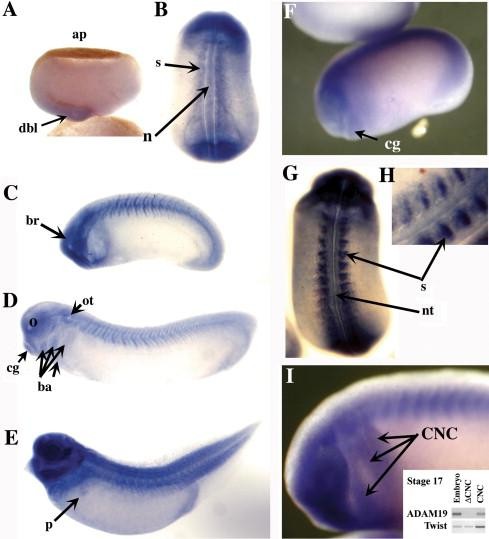 Fig. 2. ADAM19 mRNA distribution. Whole mount in situ hybridization using a probe corresponding to Xenopus ADAM19. (A) Lateral view of a bisected gastrula with the dorsal side to the left and the animal pole at the top (ap). (B and G) Dorsal views of early tailbud stage embryos with the anterior at the top. (CâE, I) Lateral views of tailbud stage embryos with anterior to the left. (F) Ventral view of an early tailbud stage embryo. Photographs in (A, F and I) were taken with embryos in PBS to visualize superficial rather than internal staining. All other embryos were imaged in Murrayâs clear. (A) ADAM19 is first expressed in the dorsal mesoderm of the gastrula, with the most intense signal in the dorsal blastopore lip (dbl). (B, FâH) At early tailbud stage, ADAM19 is found in the dorsal mesoderm including the notochord (n), somites (s), the cement gland (cg) and the neural tube (nt). (C, D and I) ADAM19 expression in these tissues persists during tailbud formation. In the anterior, ADAM19 is expressed in the brain (br), the otic (ot) and optic (o) vesicles as well as CNC segments and branchial arches (ba). (E) At stage 36, the expression in the pronephros (p) is also detected.