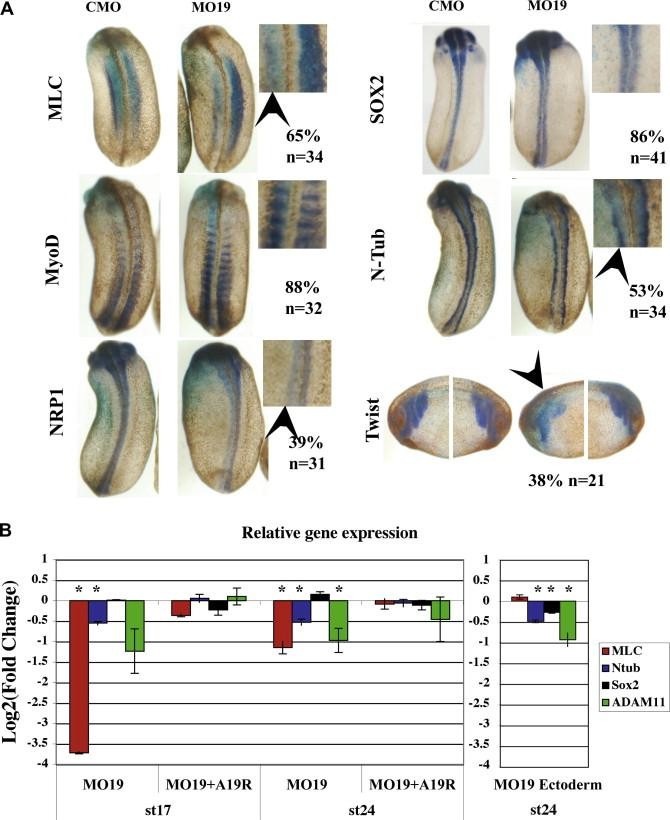 Fig. 7. Phenotypical analysis of ADAM19 KD at tailbud stage. (A) Whole-mount in situ hybridization of tailbud stage embryos (stages 22â24). Embryos were injected in one blastomere of the two-cell stage with 10 ng of MO19 or CMO. mRNA encoding β-galactosidase (β-Gal) was co-injected as a tracer. The embryos were processed by whole mount in situ hybridization with the markers myosin light chain (MLC), N-tubulin, NRP1, Sox2 and ADAM11. The injected side, as detected by β-Gal activity (light blue), is on the left side for all embryos. The percentages of embryos displaying these phenotypes are indicated and represent the average of three independent experiments. The black arrowheads point to the area of decreased gene expression. For Twist the embryo heads are presented as a side view. The injected side of each embryo is to the left. Decrease in twist expression is visible (arrowhead) in embryos injected with MO19. (B) Quantitative real-time PCR was performed on embryos injected at the one-cell stage with either the MO19 alone or with the ADAM19 rescue mRNA (MO19 + A19R) and allowed to develop until neurula (stage 17) and tailbud stage (stage 24). Alternatively, the MO19 was injected in 2 dorsal-animal blastomeres at the 8-cell stage (MO19 Ectoderm) to target dorsal ectoderm but not mesoderm derivatives. All genes were compared to non-injected control embryos. The relative abundance of MLC, N-tubulin, Sox2 and ADAM11 gene expression was measured by the 2(-δCT) method and normalized to α-tubulin. Results are presented as the log 2 of the fold change. Error bar correspond to the standard error. Asterisks represent a P < 0.05 using a standard t test assuming unequal variance.