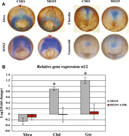Fig. 5. Phenotypical analysis of ADAM19 KD at the gastrula stage. (A) Embryos were microinjected with 10 ng of either the MO19 or a control MO at the one-cell stage and allowed to develop until gastrula stage (stages 12 and 13). Whole mount in situ hybridization were performed using the markers Brachyury, Sox2 (XbraSox2, stage 12) and Chordin and Goosecoid (Chd and Gsc, stage 13). For all embryos, the dorsal view is presented with the anterior up. The red arrowheads point to the notochord. The number of embryos and the frequency of the phenotype depicted in the photographs are indicated in the text. (B) Quantitative real-time PCR was performed on embryos injected with either MO19 alone or together with ADAM19 Rescue mRNA (MO19 + A19R). The relative abundance of Chordin (Chd), Goosecoid (Gsc) and Brachyury (XBra) gene expression was measured by the 2(-) method using either embryos injected with the control MO or non-injected and normalized to α-tubulin. There was no effect of the control MO to gene expression. The asterisks represent statistical significance at P < 0.05 using a Student t test. There is a small decrease in Xbra (16%, not significant) and a robust increase in both Chd (187%) and Gsc (230%) which are rescued by the injection of the ADAM19 mRNA.