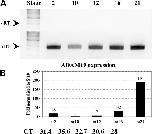Fig. 1. ADAM19 expression. Quantitative real-time PCR expression of ADAM19 during early Xenopus development. Polyadenylated RNA from 2.5 embryos was used to make cDNA. PCR amplification was performed on a light cycler for 40 cycles. (A) The amplification product from both the control (âRT) and the experimental (+RT) were separated on a 2% agarose gel. (B) The relative abundance of the ADAM19 mRNA was measured by the 2(-δCT) method using stage 10 as a value of 1. Values are not adjusted to a control gene but to identical number of embryos. The CT values for each reaction are given below the graph. No CT values were obtained for the âRT control of each stage. ADAM19 mRNA is present as a maternal transcript at stage 2. Zygotic transcription starts during gastrulation and increases during neurulation (stage 16) continuing into early tailbud stage (stage 21).