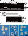 Blocking FGF signaling in animal cap explants induced endoderm that lacked mesoderm inducing activity. (A) Tissue recombination technique. (B) DNFR-expressing recombinants (DNFR animal cap/control animal cap) also expressed early and later endoderm genes, Mixer and edd, as expected. However, the recombinants did not induce the early mesoderm marker, Xbra, nor the late mesoderm markers, actin and globin. An early ventralmesoderm marker (GATA2) was detected in the DNFR animal cap/control animal cap recombinants. This result indicates that the absence of FGF signaling in animal cells generates endoderm, but it is not competent to induce mesoderm in adjacent tissue. RT(â) lane was omitted.