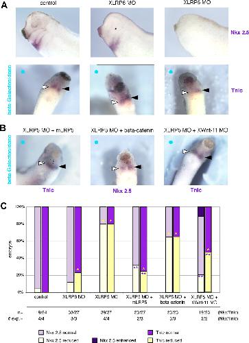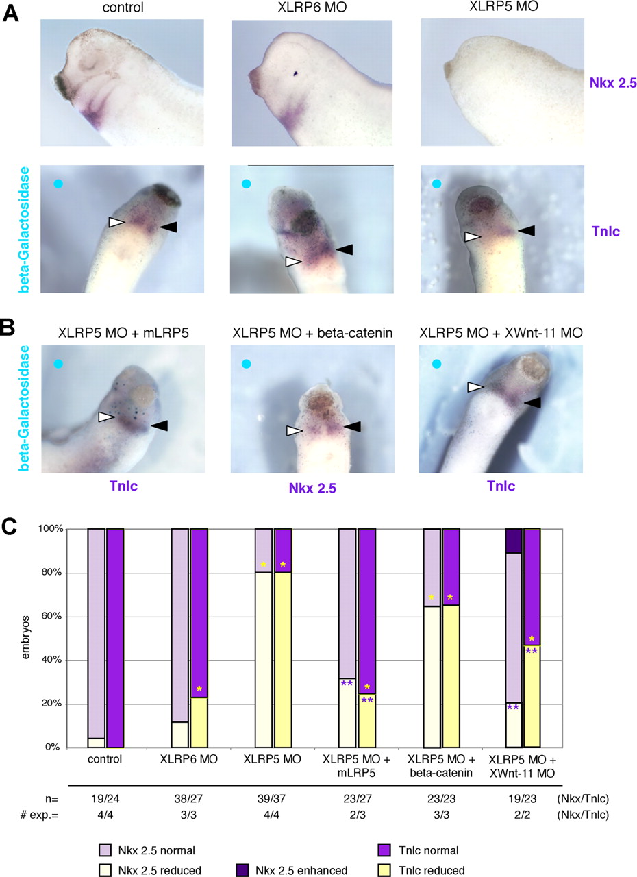 Figure 4. XLRP5/6 regulate heart development. (A) Knockdown of XLrp5 and XLrp6 affects heart development. Embryos injected with XLRP5 and XLRP6 MO in one or both dorsal blastomeres were analyzed by whole mount ISH for the expression of heart markers Nkx2.5 and Troponin lc (Tnlc) at stage 28. Injected side shown by blue circle in single-blastomere injections, open triangle shows Tnlc/Nkx2.5 on injected side, closed triangle shows TnIc/Nkx2.5 on uninjected side. (B) XLRP5 MO-induced reduction in heart markers can be rescued with mLrp5 and XWnt-11 MO (Tnlc) and only partially rescued with β-catenin overexpression (Nkx2.5). (C) Quantification of ISH analysis of cardiac markers (*, significantly differs from β-galactosidase controls; p > 0.95); **, significantly differs from XLRP5MO; p > 0.95).