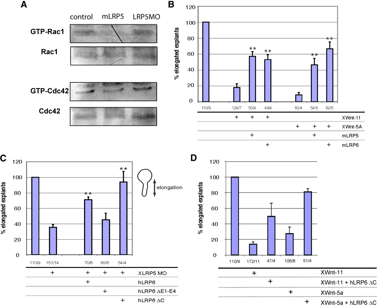 Figure 3. (A) Embryos injected with mLRP5 or XLRP5 MO were lysed and analyzed for the activity of small GTPases Rac1 and Cdc42. (B) XWnt5a- or XWnt11-induced CE defects can be partially rescued by coinjection of Lrp5 or Lrp6 (**, significant rescue of XWnt-11 and XWnt-5a, respectively; p > 0.95). (C) Effects of FL and mutant hLRP6 on CE defects induced by XLRP5 MOs. hLRP6 and also hLRP6 lacking cytoplasmic domain (hLRP6ΔC) can efficiently rescue XLRP5 MO defects, whereas hLRP6 lacking the extracellular domains E1-E4 cannot (**, significant rescue of MO; p > 0.95). (D) Lrp6 lacking cytoplasmic domain (hLRP6ΔC) can rescue elongation defects caused by overexpression of XWnt-11 or XWnt-5a. The numbers under the graphs indicate number of injected embryos/number of independent experiments.