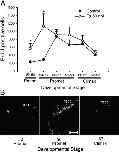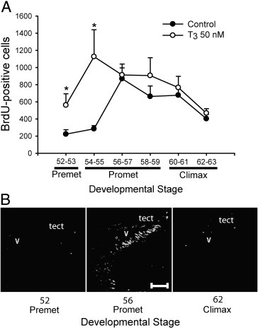 Fig. 3. (A) Profiles of brain cell proliferation during spontaneous metamorphosis and following T3 treatment, measured by the number of BrdU-positive cells. Tadpoles were treated as described for Experiment 3 (see Fig. 1). During spontaneous metamorphosis (Control) cell proliferation was low at premetamorphic (Premet) stages, peaked during prometamorphosis (Promet; NF stage 56â57) and declined at metamorphic climax (Climax; NF stage 62â63). T3 treatment significantly increased cell proliferation at premetamorphic and early prometamorphic stages but failed to alter cell proliferation at later stages. (B) Developmental changes in BrdU labeling in the tadpole optic tectum. There were numerous BrdU-ir cells at prometamorphosis (NF stage 56; b); whereas, there were few BrdU-ir cells in premetamorphic (NF stage 52; a) or late prometamorphic (NF stage 62; c) brains. tect, optic tectum; V, ventricle. Scale bar = 50 μm.