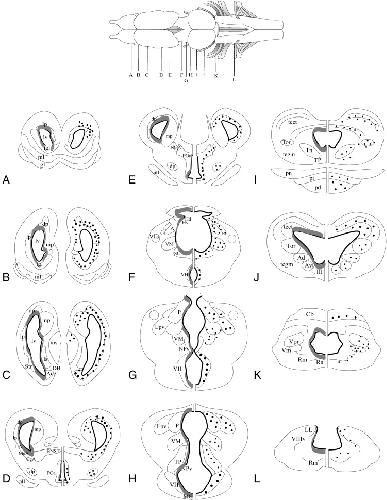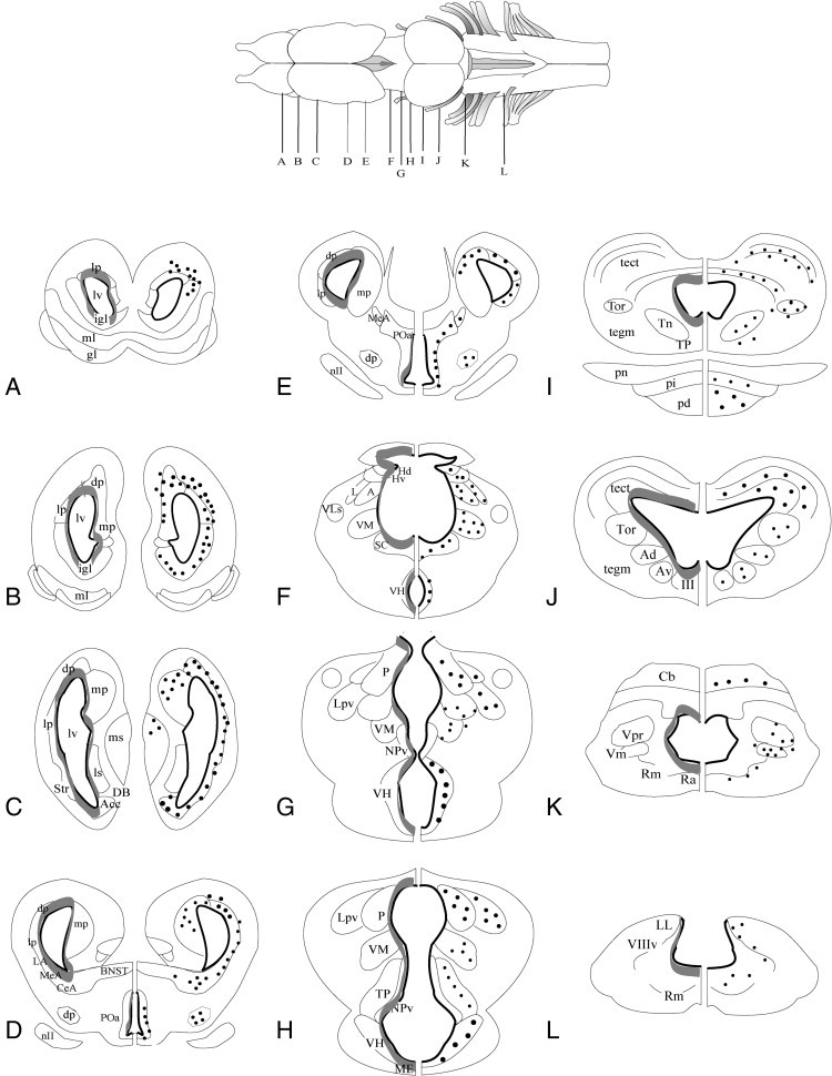 Fig. 5. (AâL) Schematic coronal illustration of neurogenic zones (gray bands surrounding ventricles on left of sections; identified by the distribution of BrDU and pH3 immunoreactivity) and thyroid hormone receptor β (TRβ) immunoreactivity (-ir; large and small dots on right of sections) distribution in the brain of NF stage 52 X. laevis tadpoles following 48 h treatment with T3 (50 nM). TRα mRNA, which is not shown in the figure, is highly expressed in all neurogenic zones and many other areas throughout the tadpolebrain. The drawing at the top of the figure shows a dorsal view of the X. laevis brain. Letters correspond to the rostrocaudal location of sections as depicted in the whole-brain drawing. Large circles represent large cells that exhibited robust TRβ-ir, and small circles represent smaller TRβ-ir cells. The anatomical drawings are from Tuinhof et al. (1998), with modifications of basal ganglia subdivisions according to (MarÃn et al., 1998). Abbreviations are defined in Table 2.