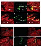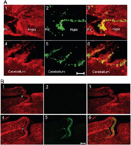 Fig. 7. (A) Thyroid hormone receptor alpha (TRα) mRNA colocalizes with BrdU-ir in tadpolebrain. Premetamorphic (NF stage 52) tadpoles were treated as described for Experiment 3 (see Fig. 1). Dual labeling histochemistry was conducted for TRα mRNA (red; by ISHH) and BrdU (green; by IHC) on sagittal sections of T3-treated tadpolebrain (regions shown are the diencephalon and cerebellum). Sections were analyzed by confocal microscopy. Note the colocalization of TRα mRNA and BrdU-ir in cords of cells adjacent to the ventricles. Hypo, hypothalamus; Pit, pituitary. Scale bar = 50 μm. (B) Treatment with T3 increases TRβ immunoreactivity (ir) in tadpolebrain, and TRβ is excluded from the majority of BrdU-positive cells. Premetamorphic tadpoles (NF stage 52) were treated as described for Experiment 3 (see Fig. 1). Dual fluorescent immunohistochemistry was conducted for BrdU (green) and TRβ (red) without (1â3) or with (4â6) T3 treatment. Sections were analyzed by confocal microscopy. Shown is the region of the thalamus and optic tectum in the sagittal plane. In untreated tadpoles few BrdU-ir or TR-ir cells are detected (1 â TRβ, 2 â BrdU, 3 â merge), but T3 treatment significantly increased TRβ-ir (4 â TRβ) and cell proliferation (5 â BrdU). Only a small proportion of BrdU-ir cells express TRβ, as indicated by the yellow cells (6 â merge). Scale bar = 50 μm.
