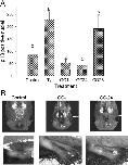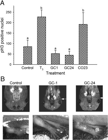 Fig. 9. The TRα selective agonist CO23, but not the TRβ selective agonists GC1 and GC24, increases cell proliferation in the premetamorphic tadpolebrain. (A) Quantification of the number of pH3-positive nuclei in the region of the lateral ventricles in tadpoles treated with vehicle (DMSO; control), T3 (10 nM), GC1 (100 nM), GC24 (100 nM) or CO23 (100 nM) for 48 h. Compounds were added to the aquarium water and were replenished after 24 h. The length of both lateral ventricles from each animal was analyzed. Shown are the data from one of two experiments that gave identical results. (P < 0.05; ANOVA; n = 4/treatment). (B) The GC compounds caused external metamorphic changes, thus showing that they had biological activity. Shown are representative tadpoles treated with vehicle (DMSO; control), GC1 or GC24 (100 nM each) for 6 days (all of the T3 treated tadpoles had died by 4 days and thus are not shown; CO23 animals were not analyzed â the effects on brain cell proliferation verified the biological activity of the CO23). The arrows point to the gills, which showed resorption following treatment with GC1 and GC24. Differentiation of the hindlimb digits was observed with both GC1 and GC24 treatment but not in controls (n = 6/treatment).
