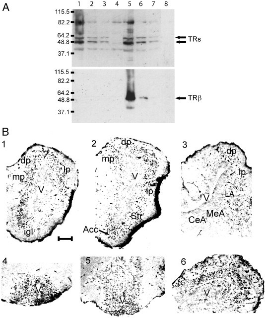 Fig. 6. (A) Western blots testing the specificity of antisera raised against synthetic peptides corresponding to xTRα (top gel; 1:1000) and xTRβ (bottom gel; 1:1000). Polyacrylamide gels (10 %) were loaded with lysates of bacteria expressing xTRα (lanes 1,2,3: 5, 2.5, 1.25 μl induced lysate; lane 4, 5 μl uninduced lysate) or xTRβ (lanes 5,6,7: 5, 2.5, 1.25 μl induced lysate; lane 8, 5 μl uninduced lysate). Note that the anti-xTRα serum crossreacts with xTRβ (arrows showing two immunoreactive bands in both lysates) and was not used for further study; whereas, the anti-xTRβ serum was specific for xTRβ and was used for IHC. (B) Representative photomicrographs of transverse sections through the brain of a NF stage 52 tadpole that had been treated with T3 (50 nM) for 48 h showing the distribution of TRβ immunoreactive (TRβ-ir) cells. 1. Dorsal pallium (dp), medialpallium (mp) and lateralpallium (lp), and internal granule cell layer (igl; Fig. 5, panel B). 2. Dorsal, medial and lateralpallium, striatum (Str) and accumbens (Acc; Fig. 5, panel C). 3. Dorsal, medial and lateralpallium, lateralamygdala (LA), medialamygdala (MeA) and central amygdala (CeA; Fig. 5, panel D). 4. Anterior preoptic area (Fig. 5, panel D). 5. Ventral hypothalamic area (Fig. 5, panel G). 6. Optic tectum (Fig. 5, panel J). Scale bar = 200 μm.