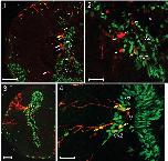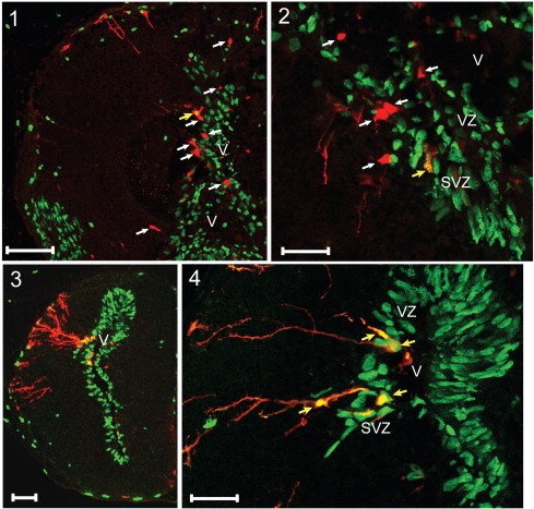 Fig. 8. Distinct populations of cells respond to T3 by proliferating (as evidenced by BrdU incorporation â green) or by upregulating the TrβA promoter (as evidenced by EGFP expression â red). Premetamorphic tadpoles (NF stage 52) were transfected with a X. laevis TrβA promoter-EGFP reporter plasmid by electroporation-mediated gene transfer, treated with T3 (50 nM) for 48 h, and then immersed in BrdU for 3 h before sacrifice and harvest of brains for dual labeling fluorescent immunohistochemistry for EGFP and BrdU. Transverse sections through the lateral ventricles were prepared and analyzed by confocal microscopy. 1. A majority of EGFP-positive cells (red â with white arrows) were BrdU negative. The yellow arrow shows one cell with colocalization of EGFP and BrdU. Scale bar = 100 μm. 2. High magnification image showing that most EGFP-positive cells are located at the periphery of the subventricular zone (SVZ), with few in the ventricular zone (VZ). Scale bar = 50 μm. 3. Some EGFP expressing cells exhibited long processes that extended out to the pial surface characteristic of radial glia. Scale bar = 200 μm. 4. Most radial glial cells expressing EGFP were BrdU positive (yellow arrows) with cell bodies located in the SVZ. Scale bar = 50 μm.