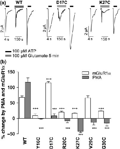 Fig. 5. The effects of mGluR1α receptor activation on P2X1 receptor mutants. (a) Sample traces for a given oocyte co-expressing either WT P2X1, D17C or K27C mutant P2X1 receptor with mGluR1α receptors. Responses to a maximal concentration of ATP (100 μM, indicated by bar) are shown before and after the application of glutamate (dotted line). Glutamate (100 μM) evoked an inward calcium activated chloride current and potentiated subsequent ATP evoked responses for WT and D17C mutants but not for the K27C mutant P2X1 receptor. (b) The effects of mGluR1α receptor (100 μM glutamate) and PMA (100 nM) on WT and the cysteine mutants are shown (+++p< 0.001 comparing mGluR1 receptor regulation of mutants to WT, ***p< 0.001 for mutants treated with PMA compared to the WT effect). For most of the mutants unable to exhibit the PMA potentiation, no potentiation was seen following the activation of mGluR1α receptor. However, the mGluR1α receptor stimulated potentiation was still robust for the D17C and V29C mutants.