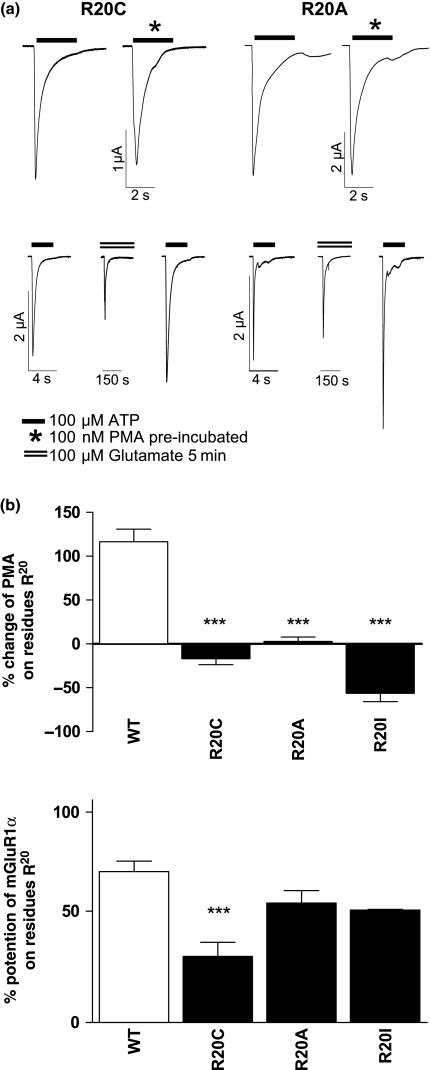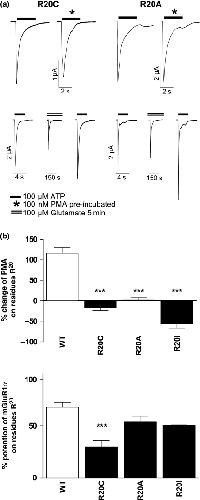 Fig. 6. The effects of PMA and mGluR1α receptor to R20 substitutions. (a) Example traces of R20C and R20A mutants in response to PMA (100 nM) or mGluR1α receptor stimulation (100 μM glutamate) are shown. Peak amplitudes from control and PMA treated oocytes are shown. In the lower panels ATP evoked currents before and after mGluR1α receptor activation from either R20C (left) or R20A (right) are shown. (b) Summary of effects of amino acid substitution at position R20 at the P2X1 receptor by cysteine, alanine or isoleucine on potentiation by PMA or glutamate. ***p< 0.001.