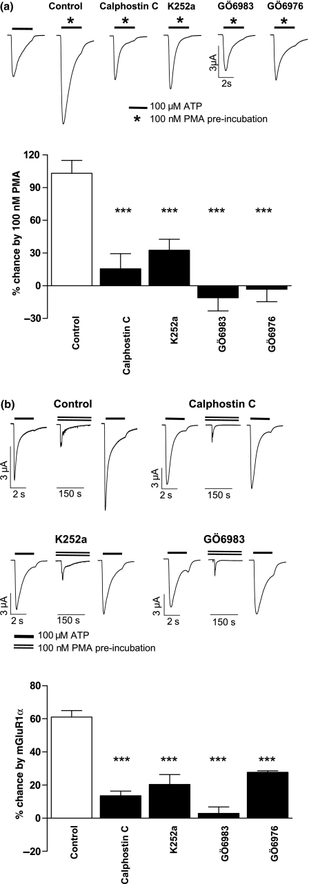 Fig. 1. Potentiation of P2X1 receptor currents by PMA and mGluR1α receptor stimulation is sensitive to inhibitors of novel isoforms of protein kinase C. (a) Representative traces of currents evoked by ATP (100 μM) under control conditions (left) and following treatment with PMA (100 nM) or PMA following incubation with the PKC inhibitors (1 h pre-incubation before 10 min of PMA) calphostin C (1 μM), K252a (100 nM), Gö6983 (200 nM) or Gö6976 (200 nM). The lower panel shows a summary of the effects of the inhibitors on PMA potentiation, n=5–19. (b) Sample traces of the effects of PKC inhibitors and mGluR1α mediated potentiation of P2X1 receptor currents. Application of glutamate (100 μM) evoked a transient inward calcium activated chloride current and potentiated the subsequent ATP current. Potentiation was reduced following pre-treatment of the oocytes with the PKC inhibitors. The lower panel shows a summary of the effects, of the inhibitors on glutamate potentiation, n=3–13. ***p< 0.001.